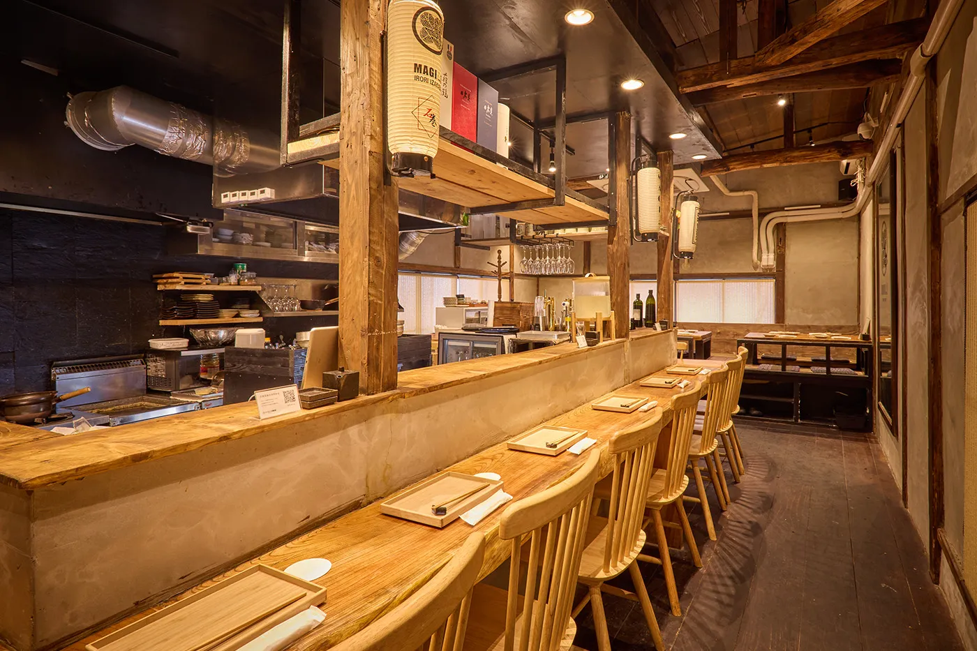 明治時代に建設された古民家を改修し、古民家の良さを残しながら、モルタルと古木を基調としたモダンな空間を演出。